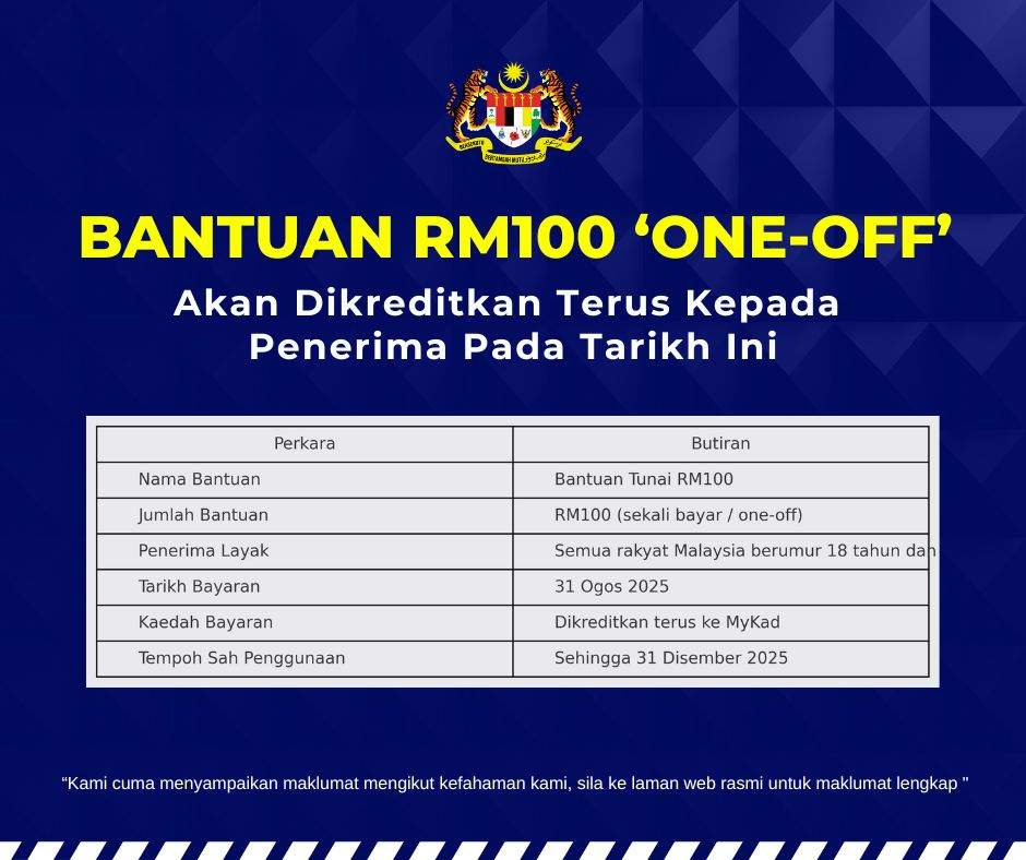 Pembayaran bantuan ini akan dibuat secara kredit terus ke MyKad penerima, pada 31 Ogos 2025 dan boleh digunakan sehingga 31 Disember 2025.