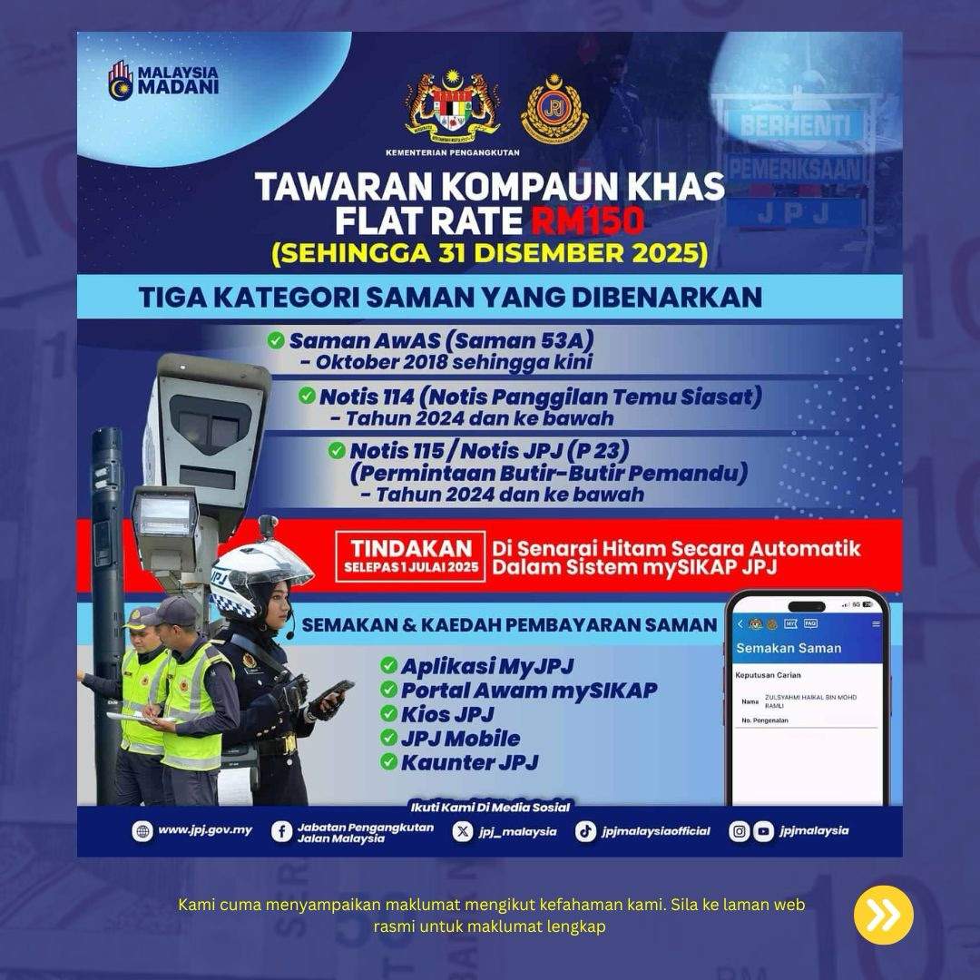 JPJ telah memaklumkan bahawa bermula 1 Julai 2025, sistem JPJ akan menyenarai hitam secara automatik mana-mana individu yang tidak menyelesaikan saman terlibat. Tindakan ini boleh menyebabkan: